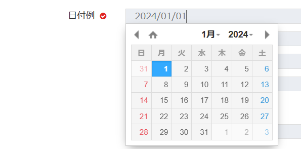 日付の登録に適したタイプです。日付とは異なる形式で入力がおこなわれると、エラーメッセージが表示されます。フォーム内をクリックするとカレンダーが下記のように表示されます。