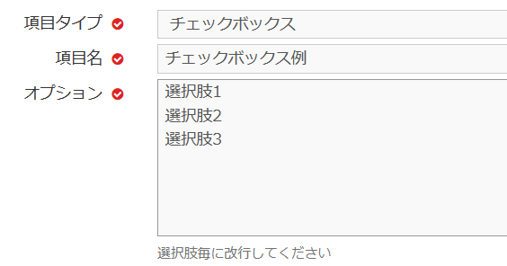 チェックボックスで複数選択できる項目タイプです。下記のように表示されます。