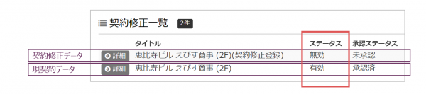 この時点では、契約修正データ(上図の1行目)の「ステータス」が「無効」になっています。