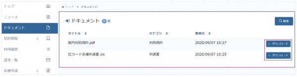 ユーザは、マイページのサイドメニュー「ドキュメント」から、次のようにドキュメントを確認できます。「ダウンロード」ボタンから、ダウンロードすることも可能です。