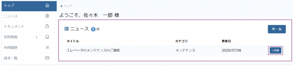 公開開始日を迎えたニュースは、マイページのトップ画面、および「ニュース」に表示されます。ユーザは、マイページのトップ画面、およびサイドメニュー「ニュース」から、次のようにニュースを確認できます。「詳細」ボタンをクリックすると、ニュースの詳細が確認できます。