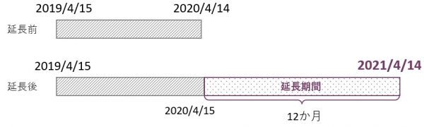 契約期間が2019/4/15~2020/4/14の場合、12か月の契約延長の結果、2019/4/15~2021/4/14に更新される