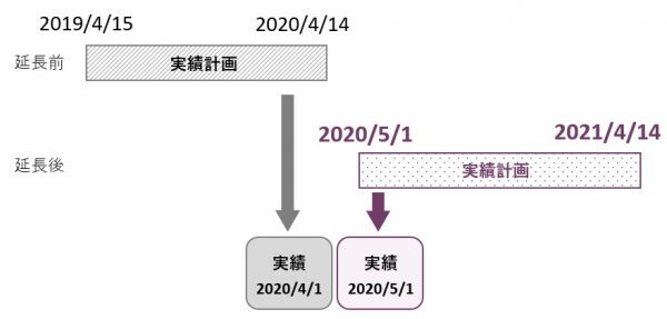 2019/4/15~2020/4/14の実績計画の場合、12か月の契約延長の結果、2020/5/1~2021/4/14に更新される