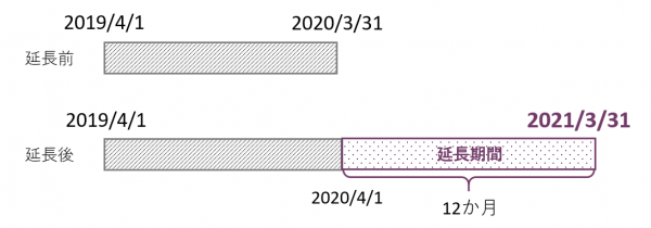 契約期間が2019/4/1~2020/3/31の場合、12か月の契約延長の結果、2019/4/1~2021/3/31に更新される