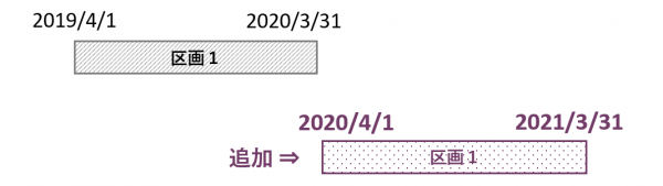 2019/4/1~2020/3/31の契約区画がある場合、12か月の契約延長の結果、2020/4/1~2021/3/31の契約区画が追加される