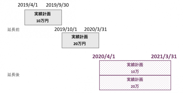 2019/4/1~2019/9/30は10万円、2019/10/1~2020/3/31は20万円という段階賃料の実績計画の場合、12か月の契約延長の結果、10万円の実績計画も20万円の実績計画も期間が2020/4/1~2021/3/31に更新される
