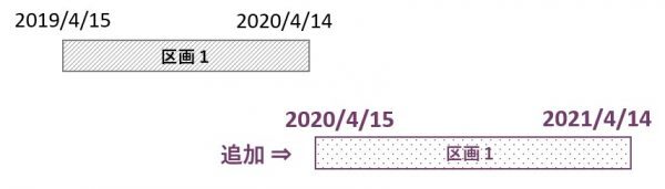 2019/4/15~2020/4/14の契約区画がある場合、12か月の契約延長の結果、2020/4/15~2021/4/14の契約区画が追加される