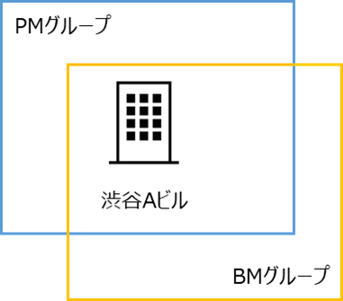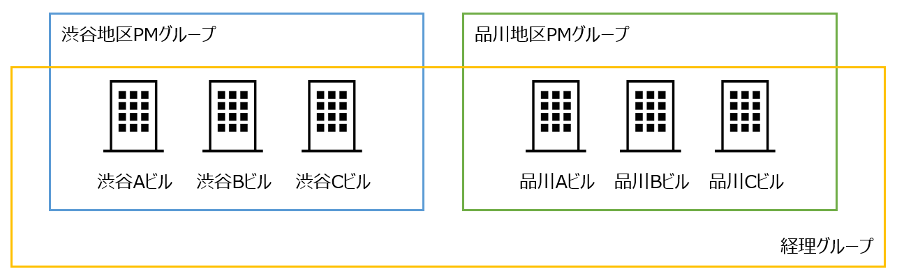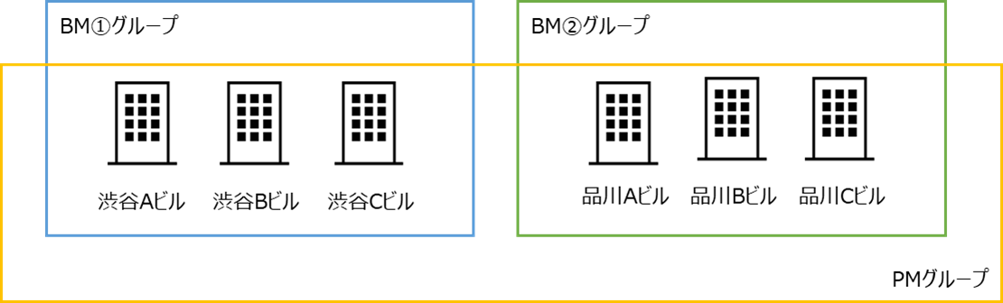 PM会社のスタッフ向けに「PMグループ」、BM会社のスタッフ向けに「BMグループ」の2つの担当グループを用意し、各担当グループに担当ビルを設定します。