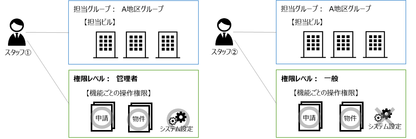 権限レベルが「管理者」のスタッフ①は、システム全体に関わるシステム設定のメニューへアクセスできるようにします。一方、権限レベルが「一般」のスタッフ②は、通常業務では操作不要であるシステム設定に関するメニューにはアクセスできないように設定します。