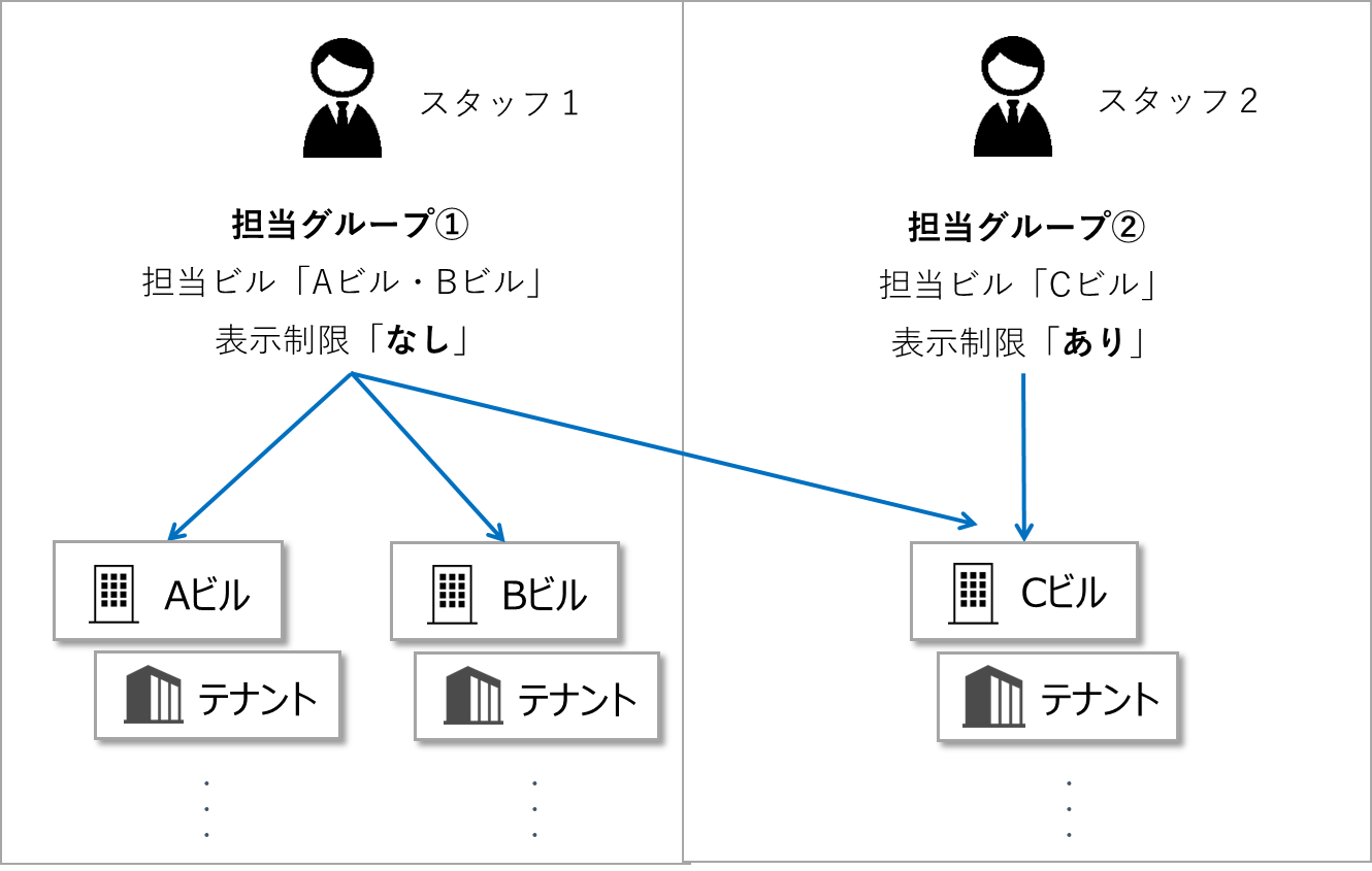 一方、表示制限が「あり」の担当グループに所属するスタッフがアクセスできるのは、担当グループに設定した担当ビルのデータのみとなります。