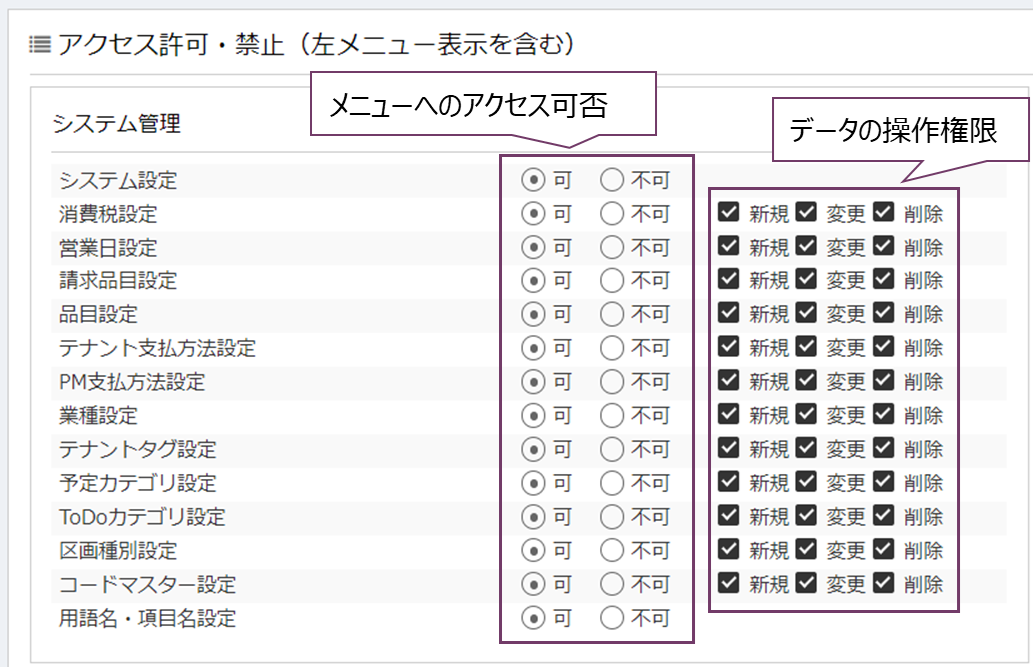 権限ごとに、管理画面の各メニューのアクセス可否と、データの操作権限の設定をおこないます。