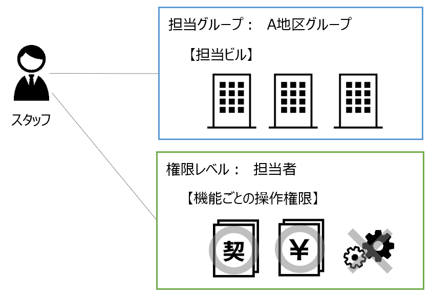 物件の種別や地域に応じて事業部等が分かれている場合、その事業部を担当グループとして設定し、各担当グループに担当ビルを設定します。一方、全てのビルを横断的に扱うマネージャーや経理等のスタッフ向けには、担当ビルを制限しない担当グループを設定します。