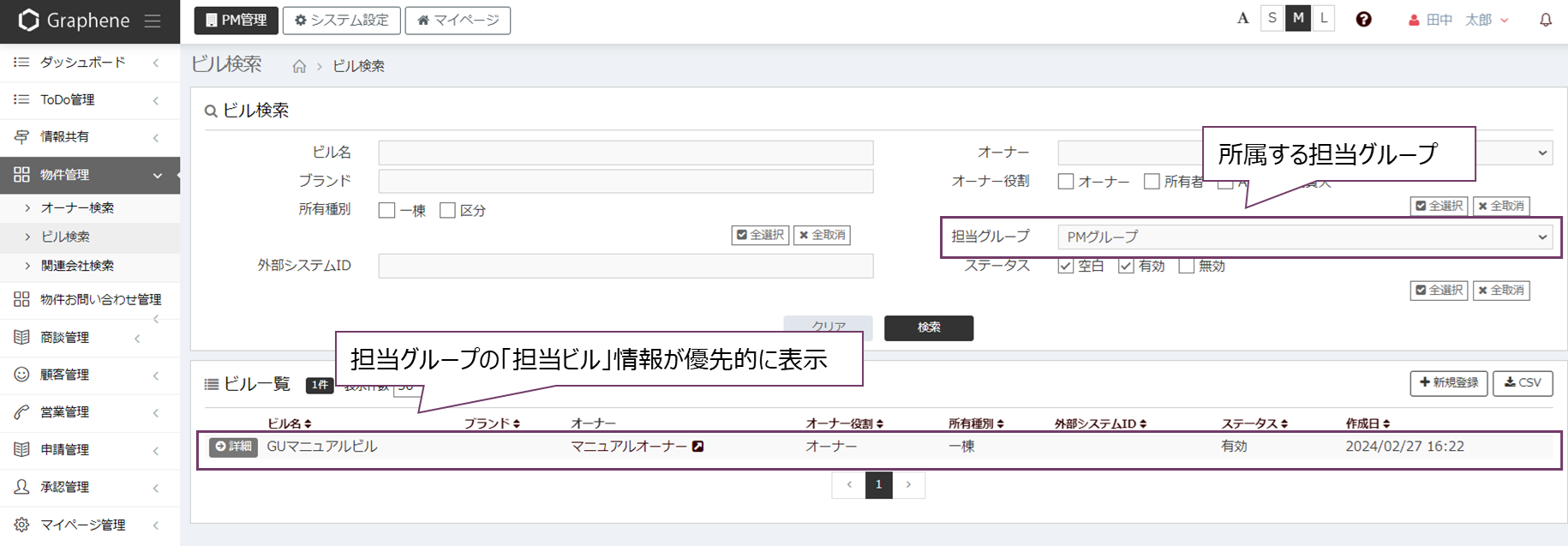 「担当ビル」が設定された担当グループに所属するスタッフには、「担当ビル」のデータが優先的に表示されるため、日常業務において必要なデータにすぐにアクセスできます。