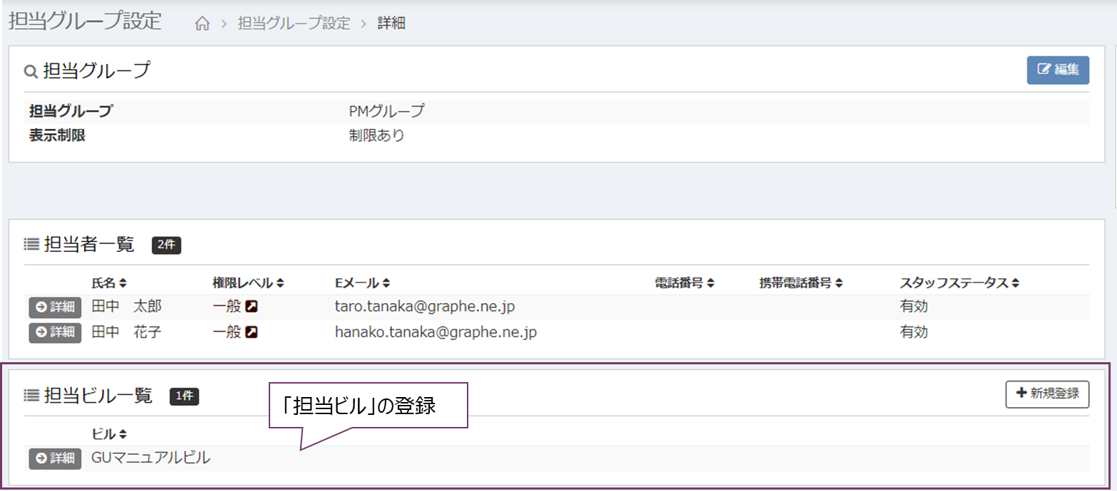 最後に、登録したビルを「担当グループ」の担当ビルに設定します。