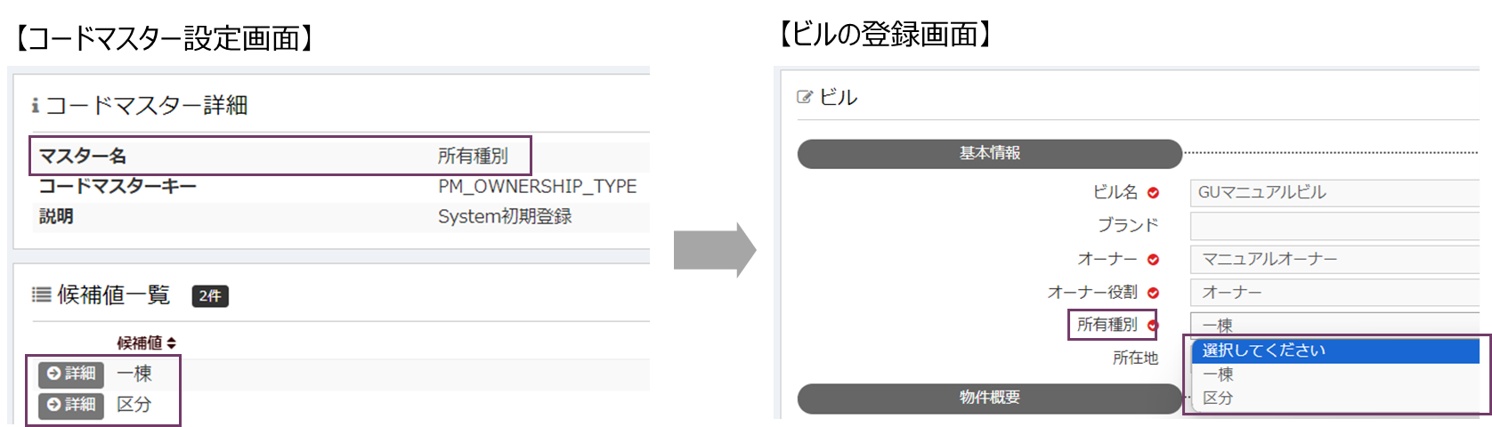 例)ビル情報として登録する「所有種別」のコードマスター設定