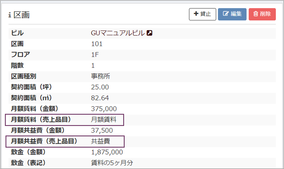 請求品目・品目の設定により、ビルに紐づく区画を登録する際、次のとおり賃料や共益費等に対する「売上品目」を入力することができるようになります。